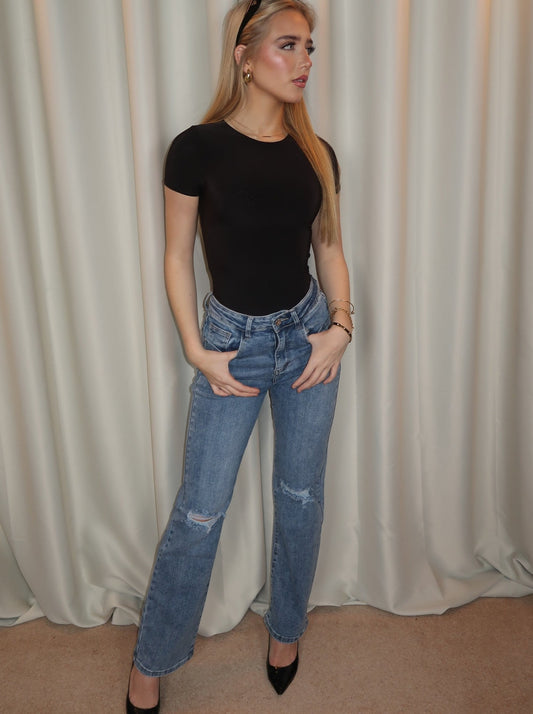 "April" Contrast Waist Wide Leg Jeans - Denim