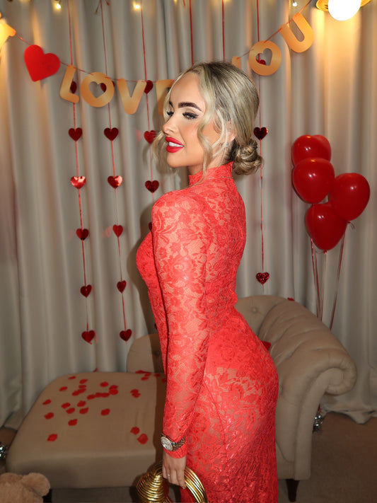"Esme" Lace Bodycon Maxi Dress In Cherry Red