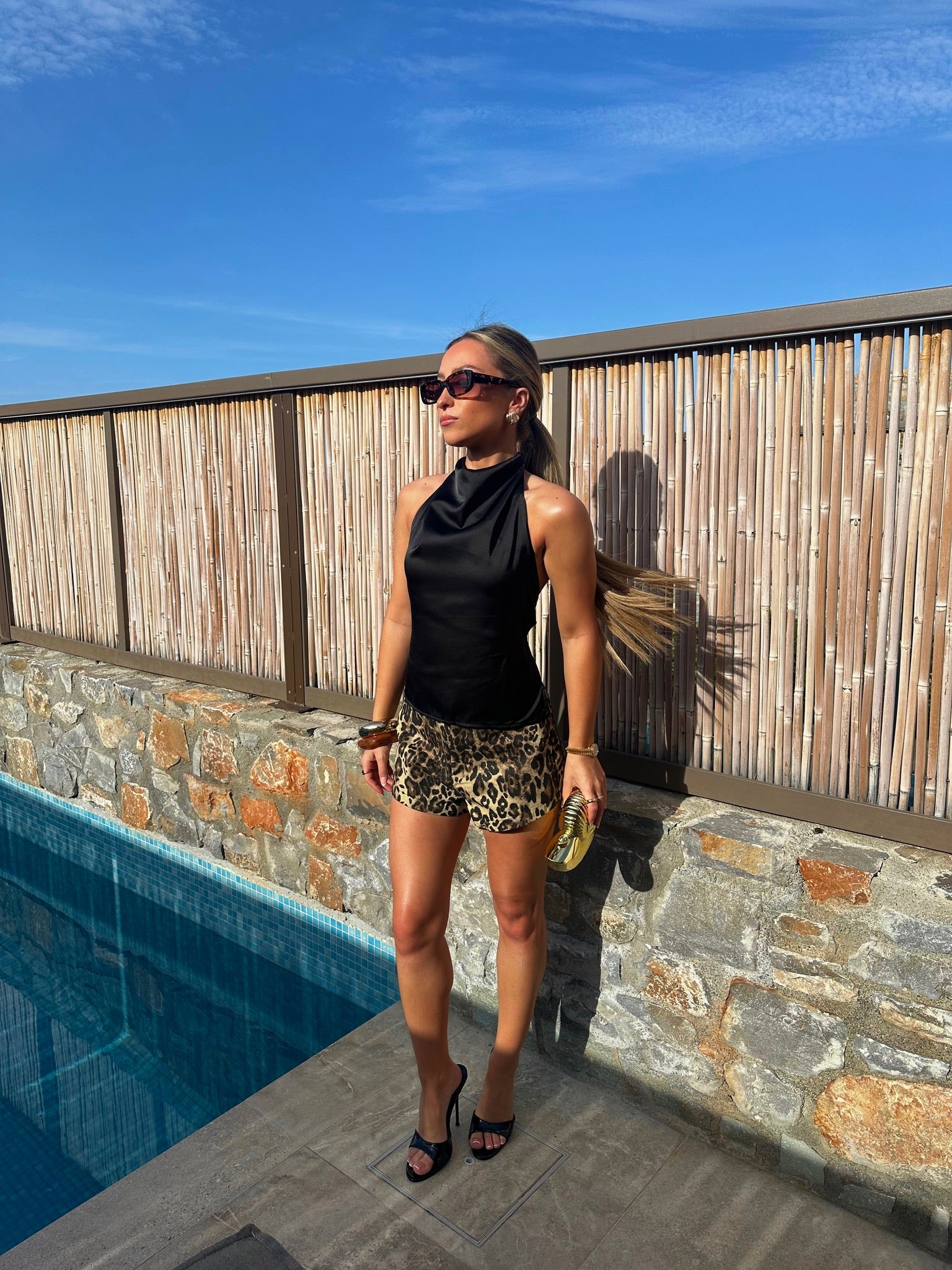 High waisted denim style shorts, zip closure belt loops, front and back pockets.